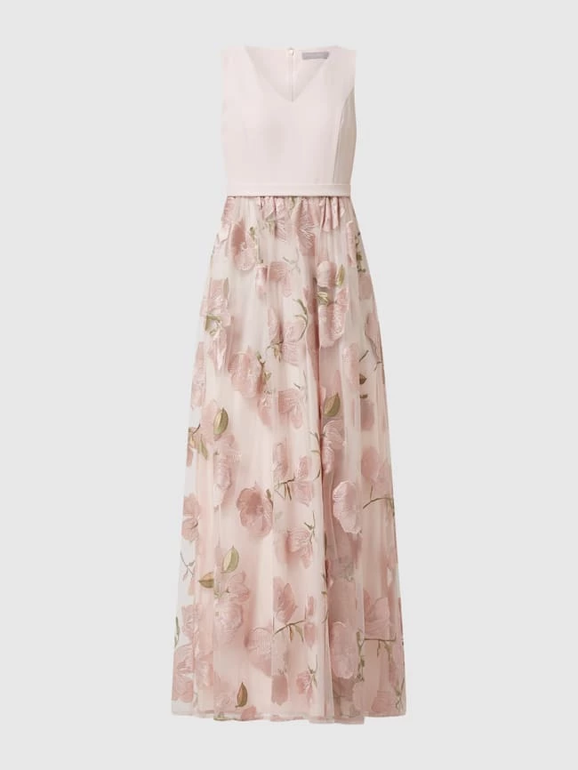 Das Abendkleid von Christian Berg Cocktail ist aus leichtem Material gefertigt. Es zeigt sich in taillierter Passform mit V-Ausschnitt, Rockteil aus Tüll und floralen Stickereien.
