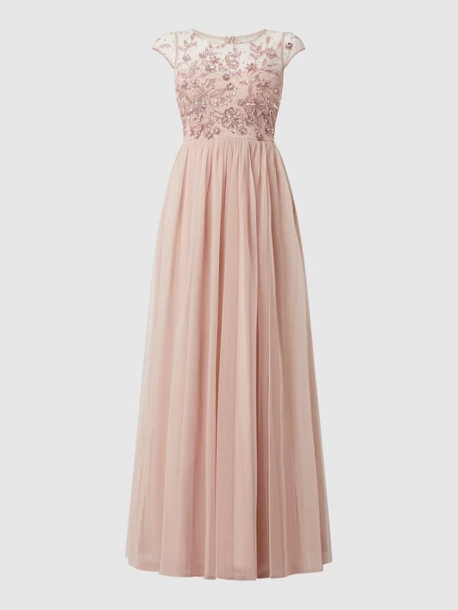 Das Abendkleid von Christian Berg Cocktail ist aus Tüll gefertigt und tailliert geschnitten. Es zeigt sich in partiell transparenter Optik mit floralen Stickereien, Pailletten und Nahtreißverschluss.