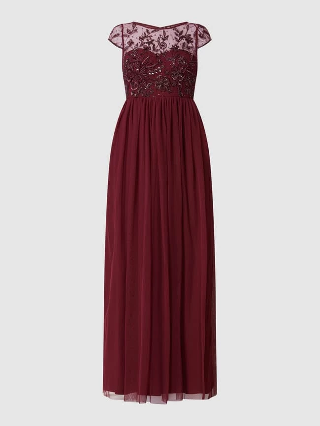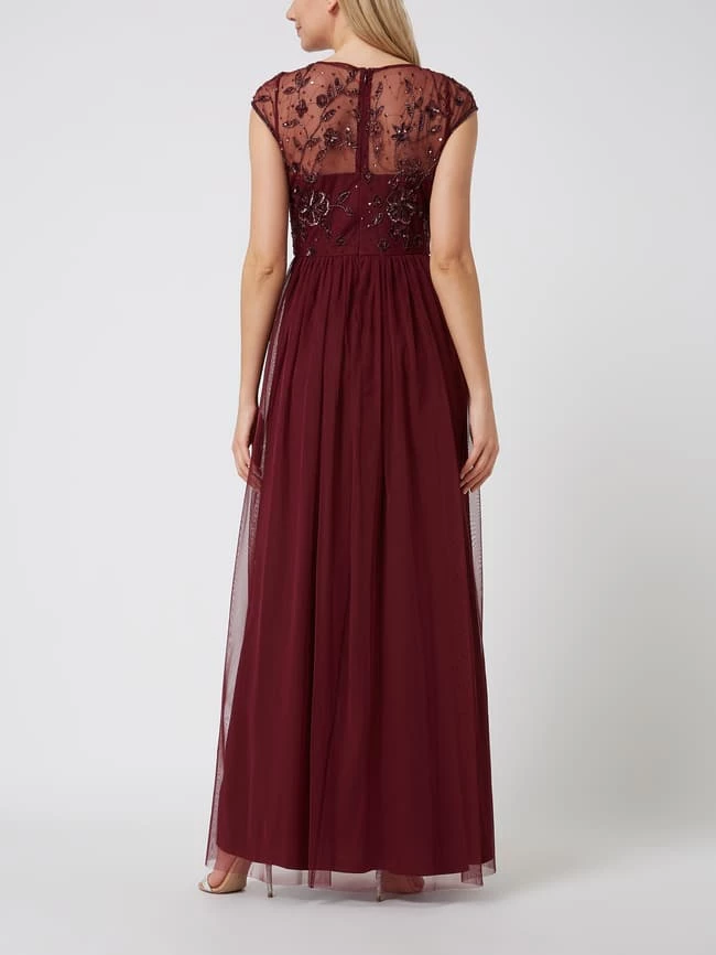 Das Abendkleid von Christian Berg Cocktail ist aus Tüll gefertigt und tailliert geschnitten. Es zeigt sich in partiell transparenter Optik mit floralen Stickereien, Pailletten und Nahtreißverschluss.