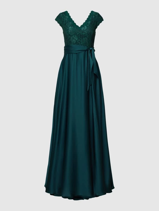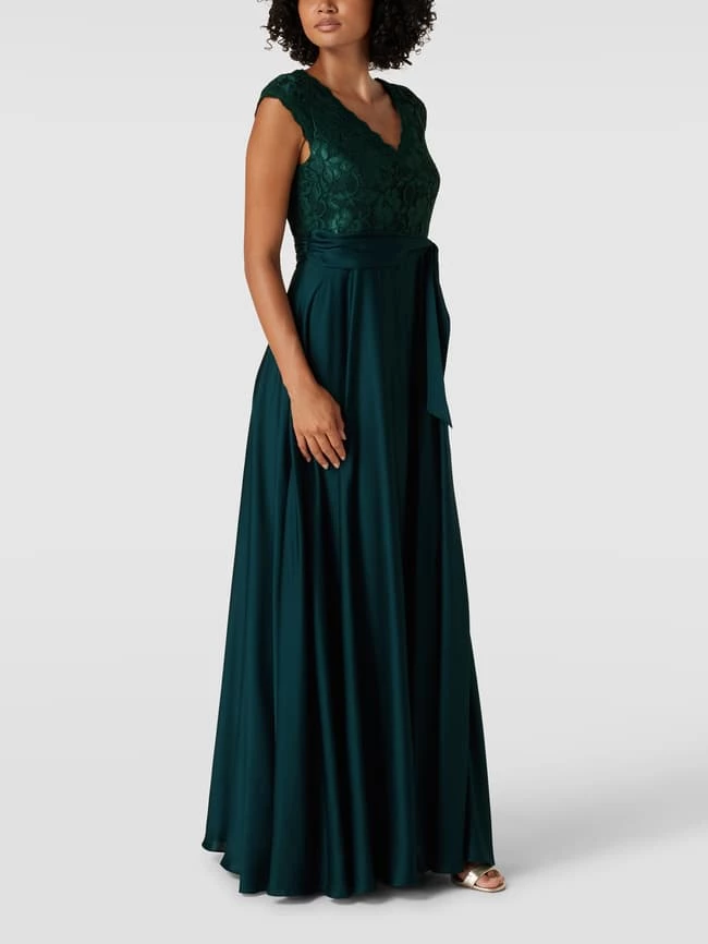 Das Abendkleid von Christian Berg Cocktail ist aus einem elastischen Material-Mix gefertigt und tailliert geschnitten. Es kommt mit Spitzenbesatz, Taillenband und V-Ausschnitt.