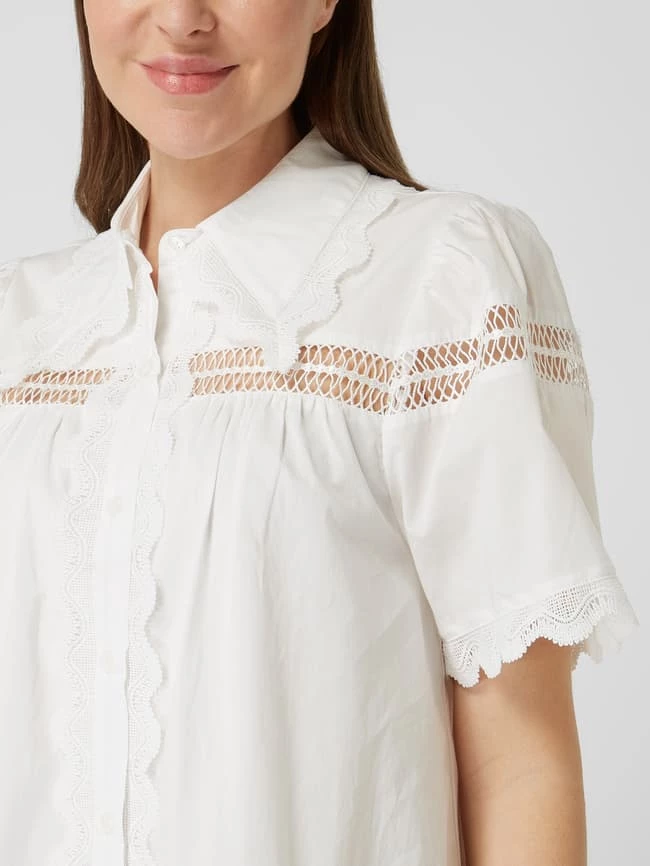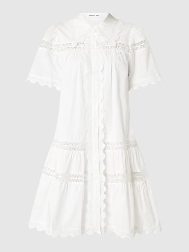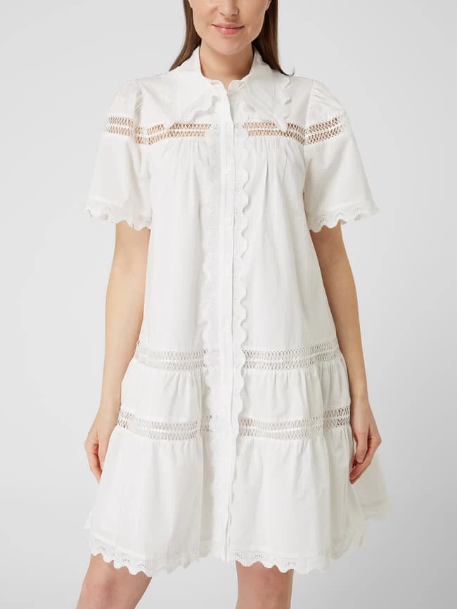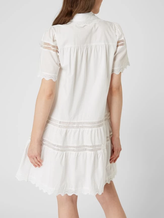 Das Blusenkleid von Designers Remix ist aus reiner Bio-Baumwolle gefertigt und ausgestellt geschnitten. Es kommt mit Umlegekragen, Rüschen und Kontrastborten aus Häkelspitze.