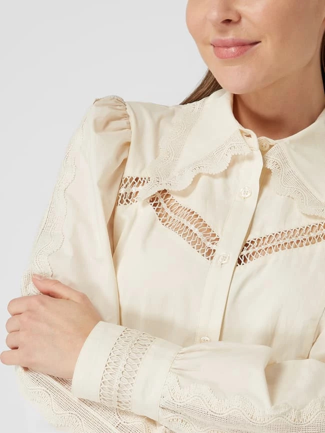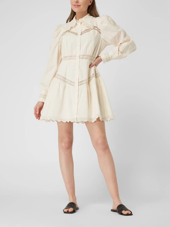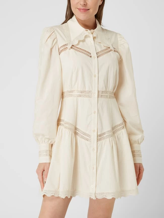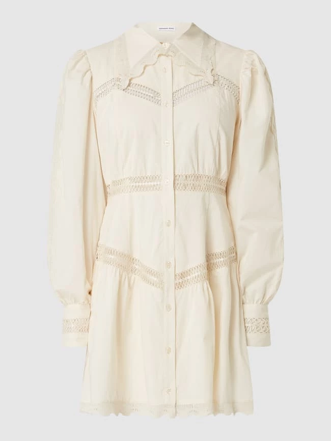 Das Blusenkleid von Designers Remix ist aus reiner Bio-Baumwolle gefertigt und tailliert geschnitten. Es kommt mit Umlegekragen, langen Ärmeln und Kontrastborten aus Häkelspitze.