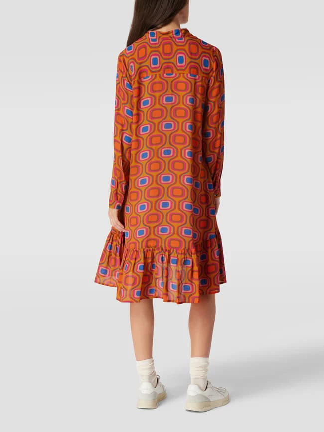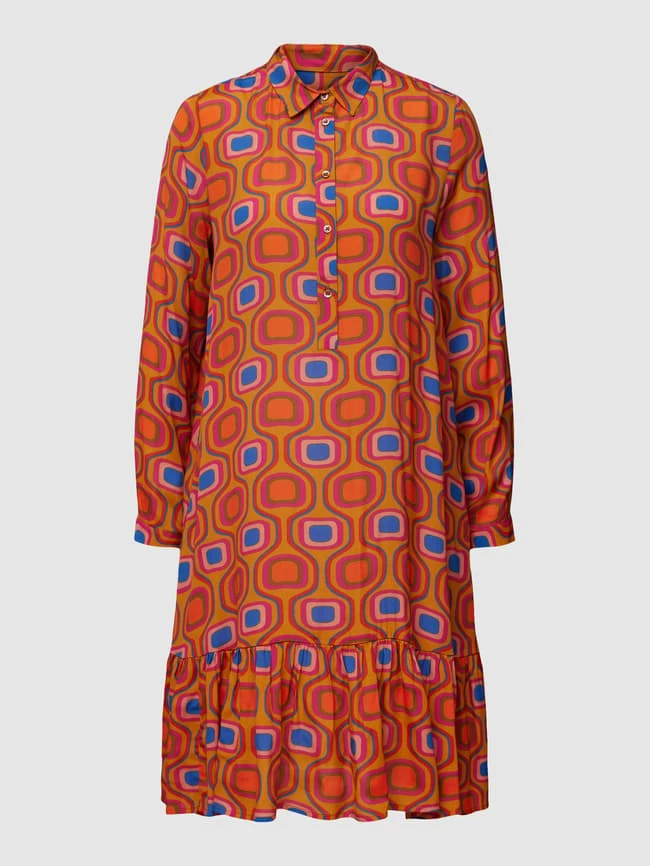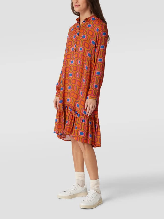 Das Hemdblusenkleid von Emily Van den Bergh ist aus reiner Viskose gefertigt und ausgestellt geschnitten. Es kommt mit Allover-Muster, Volantsaum und Kentkragen.