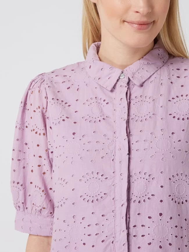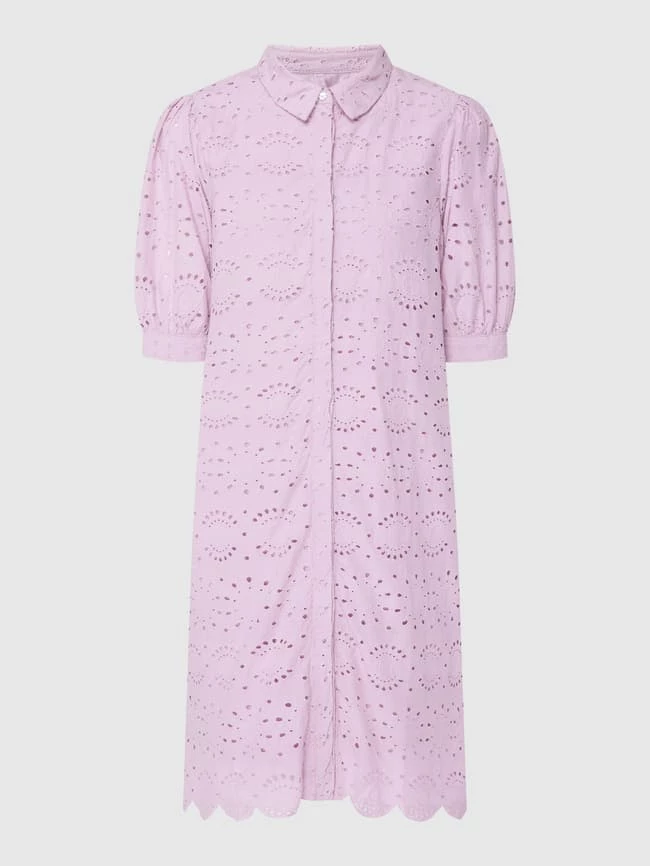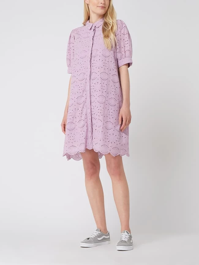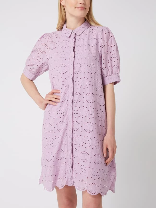 Das Blusenkleid von ICHI ist aus reiner Baumwolle gefertigt. Es zeigt sich in lockerer Passform mit Lochstickereien, verdeckter Knopfleiste und Muschelsaum.