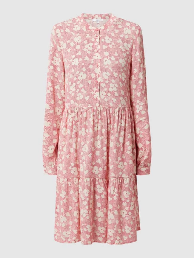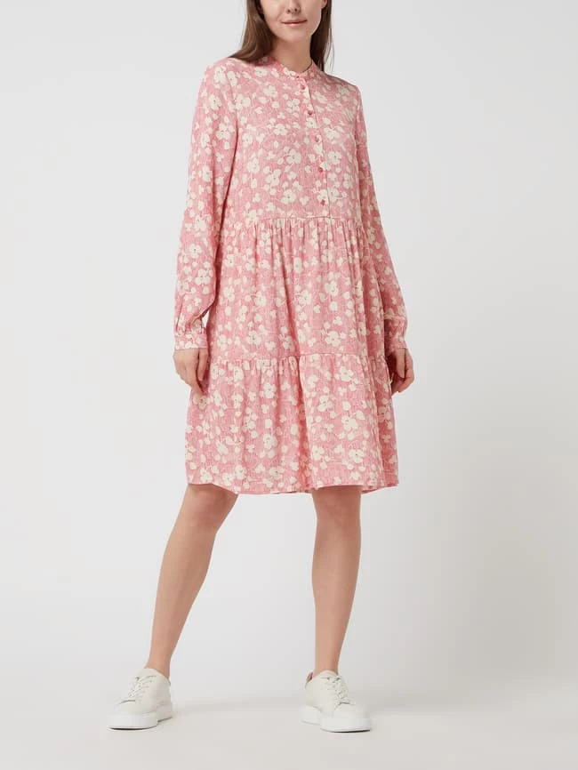 Das Kleid von Jake*s ist aus reiner Viskose gefertigt und ausgestellt geschnitten. Es zeigt sich mit floralem Muster, kurzer Knopfleiste und Eingrifftaschen.
