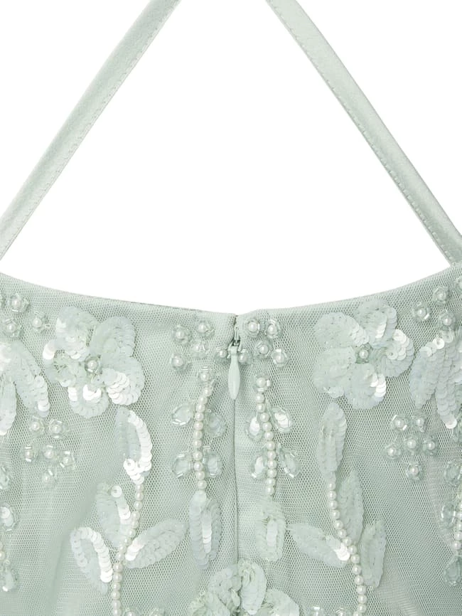 Das Abendkleid von Jake*s Cocktail ist aus Mesh gefertigt und tailliert geschnitten. Es zeigt sich mit Herz-Ausschnitt, gekreuzten Trägern und Zierperlen.