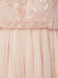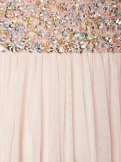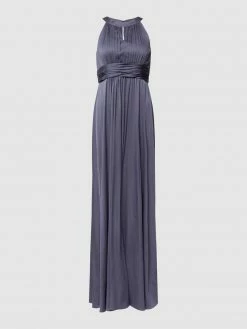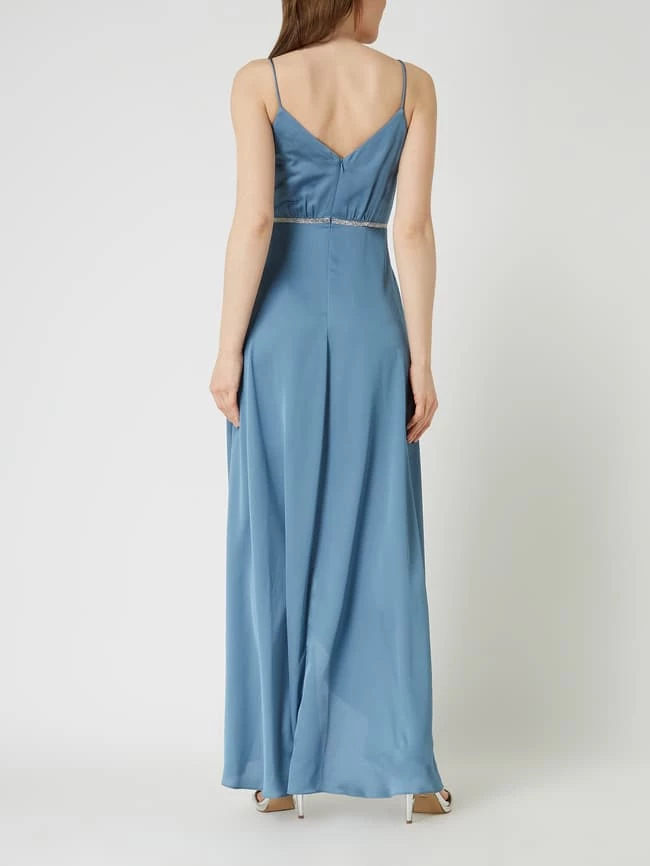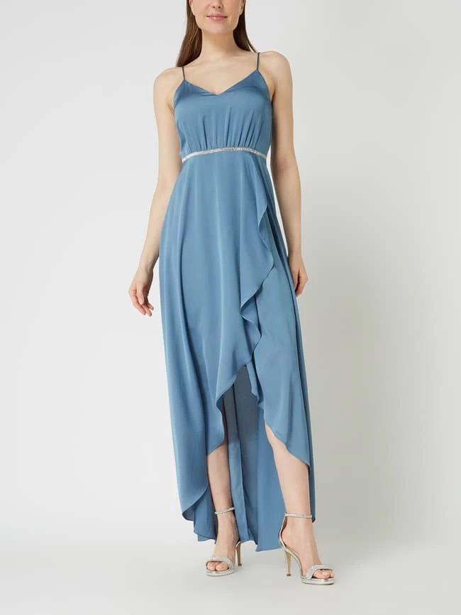 Das Abendkleid von Jake*s Cocktail ist aus Satin gefertigt und tailliert geschnitten. Es zeigt sich mit Spaghettiträgern, Strasssteinen und asymmetrischem Saum.