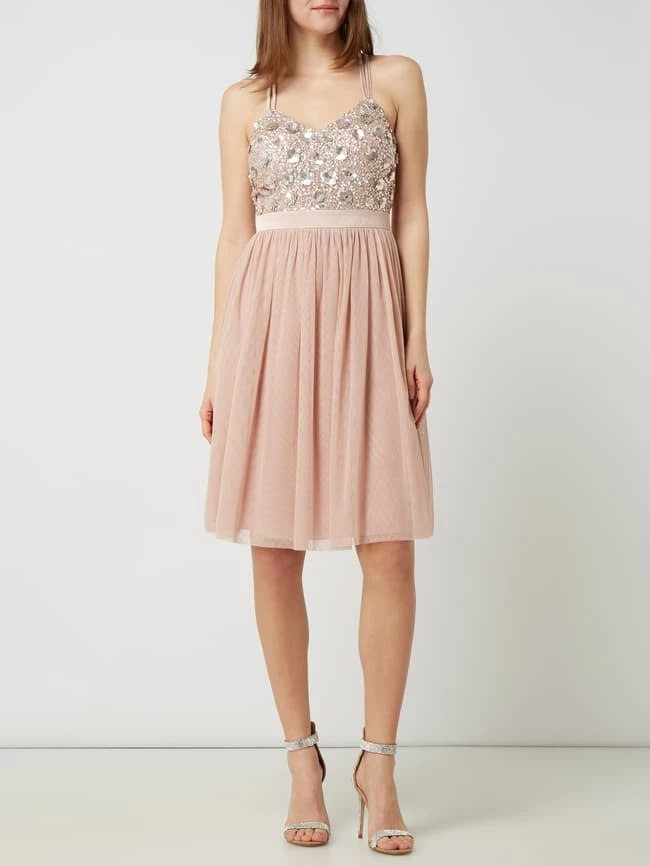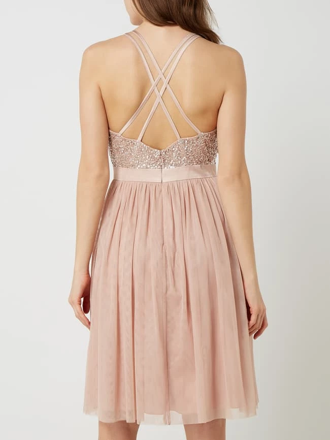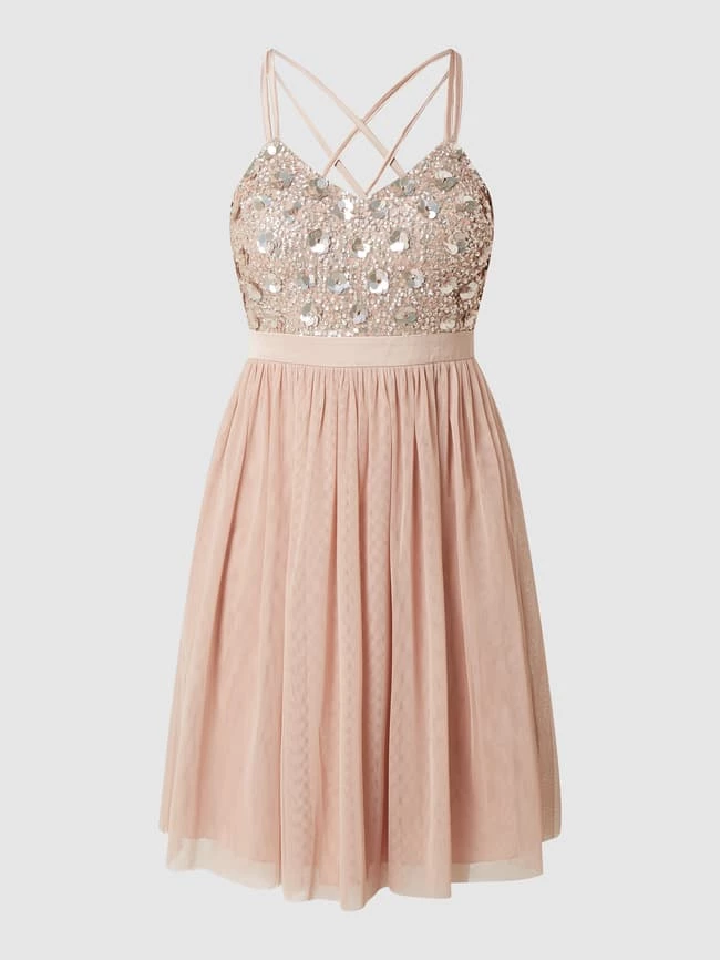 Das Cocktailkleid von Jake*s Cocktail ist aus Mesh gefertigt. Es zeigt sich in taillierter Passform mit wattierten Cups, Pailletten-Applikationen und Taillenpasse aus Satin.