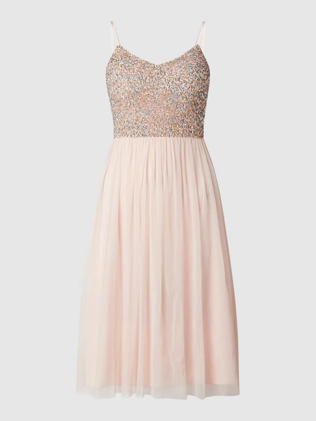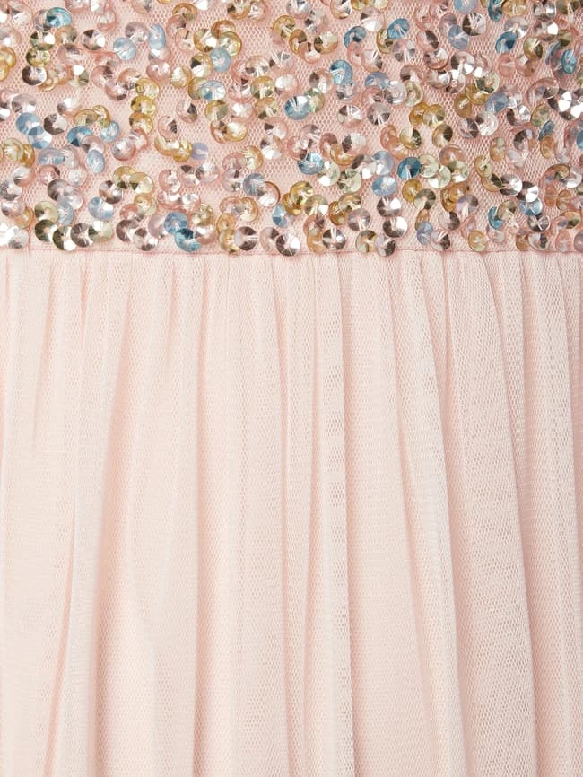 Das Cocktailkleid von Jake*s Cocktail ist aus Mesh gefertigt und tailliert geschnitten. Es zeigt sich mit wattierten Cups, schmalen Trägern und Pailletten.