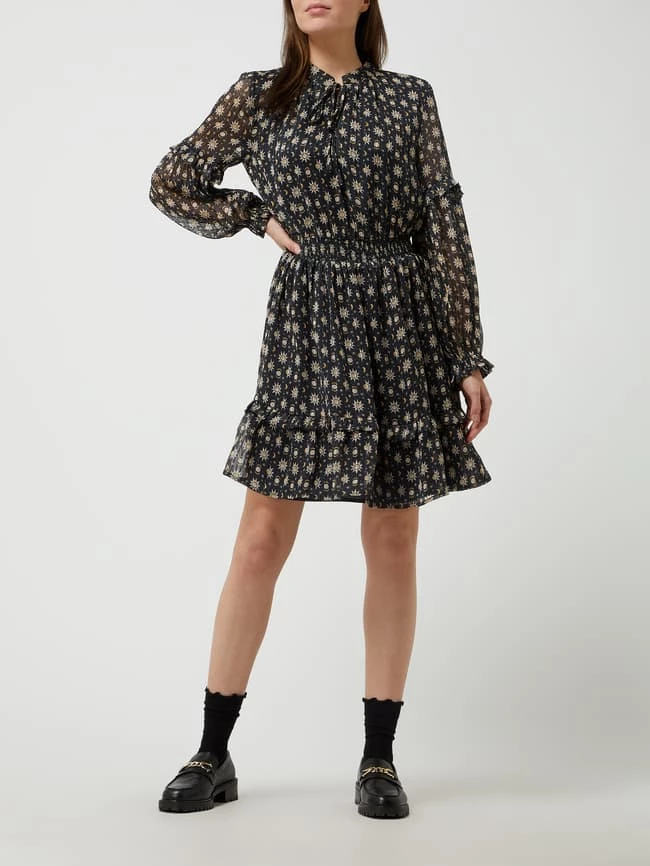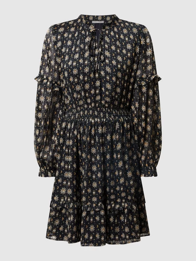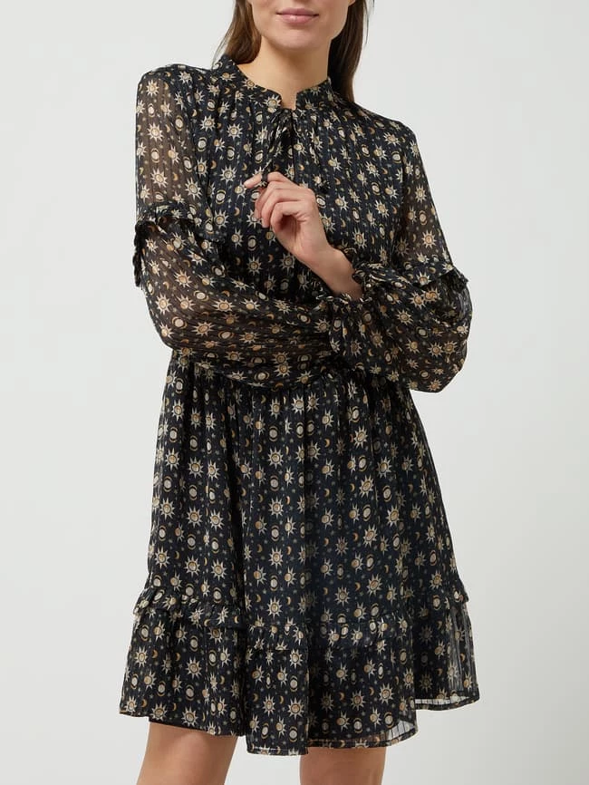 Das Kleid von Jake*s Collection ist aus Chiffon gefertigt und tailliert geschnitten. Es kommt mit Allover-Muster, Schnürung und Volantsaum.