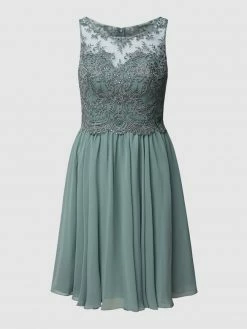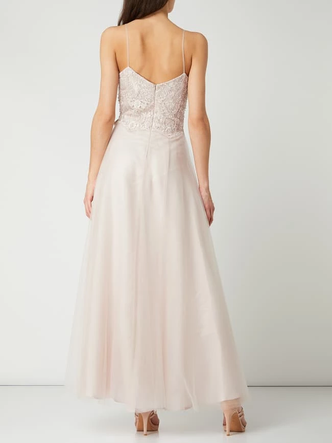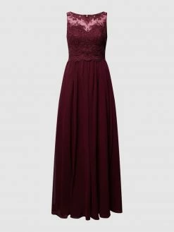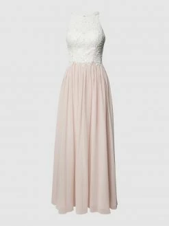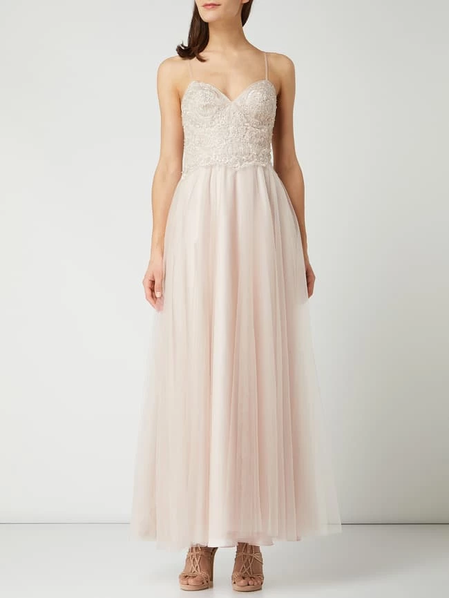 Das Abendkleid von LAONA ist aus Mesh gefertigt und tailliert geschnitten. Es zeigt sich mit Herzausschnitt, Kontrastbesatz aus floraler Häkelspitze und ausgestelltem Rockteil.
