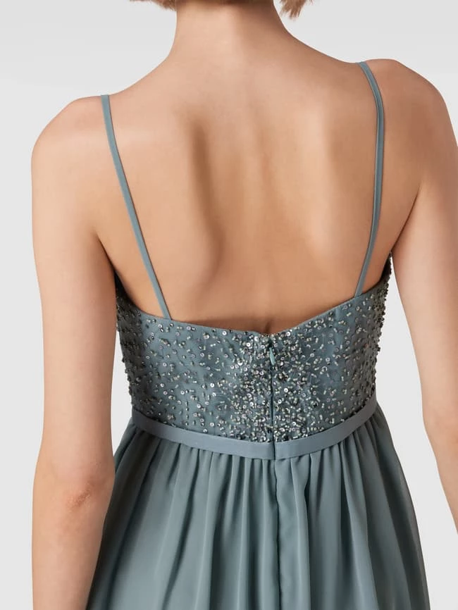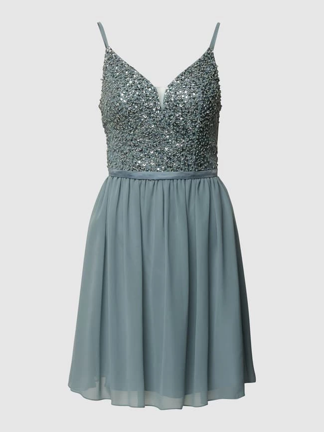 Das Cocktailkleid von LAONA ist aus strapazierfähigem Material gefertigt und tailliert geschnitten. Es zeigt sich mit V-Ausschnitt, Spaghettiträgern, Pailletten und Zierperlen.