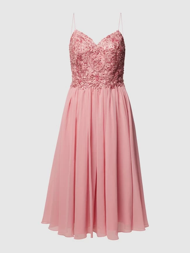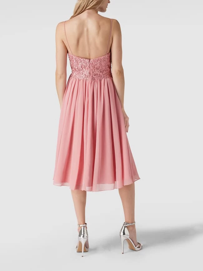 Das Cocktailkleid von LAONA ist aus robustem Material gefertigt und kommt in A-Linie. Es zeigt sich mit Spaghettiträgern, Oberteil mit Stickereien und Zierperlen und mehrlagigem Oberkleid.