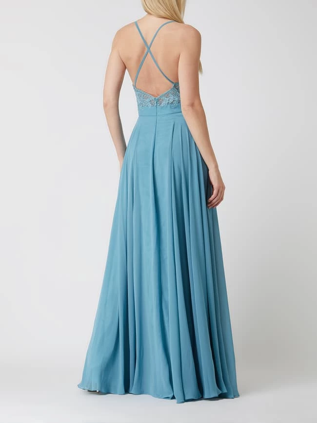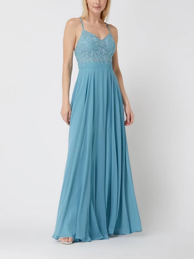 Das Abendkleid von LUXUAR MAGIC NIGHTS ist aus Spitze und Chiffon gefertigt. Es zeigt sich in taillierter Passform mit gekreuzten Spaghettiträgern, Zierperlen und ausgestelltem Rockteil.