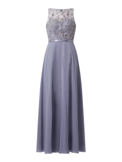 Das Abendkleid von LUXUAR LIMITED ist aus Mesh und Chiffon gefertigt. Es zeigt sich in taillierter Passform mit gekreuzten Spaghettiträgern, Strasssteinen und tiefem Rückenausschnitt.