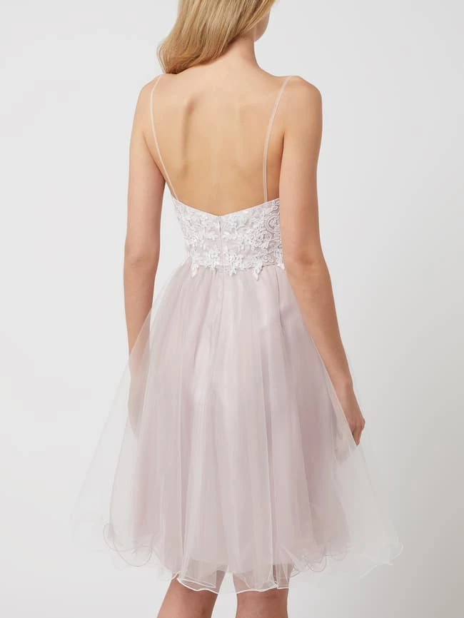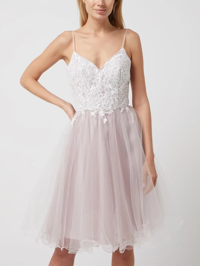 Das Cocktailkleid von LUXUAR MAGIC NIGHTS ist aus Spitze und Tüll gefertigt. Es zeigt sich in taillierter Passform mit Spaghettiträgern, Strasssteinen und ausgestelltem Rockteil mit Muschelsaum.