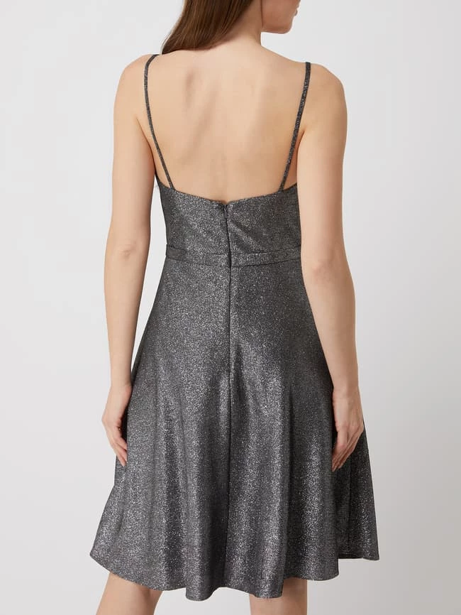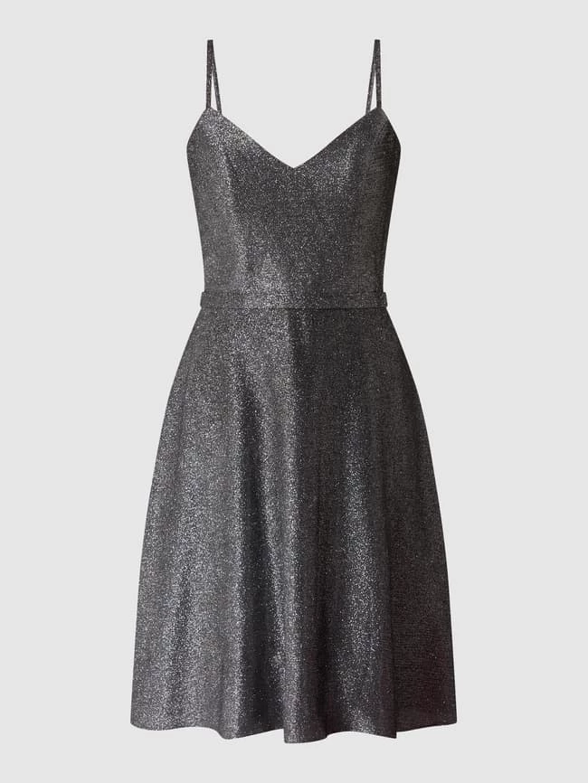 Das Cocktailkleid von LUXUAR MAGIC NIGHTS ist aus fließendem Material gefertigt und tailliert geschnitten. Es zeigt sich mit Glitter-Effekt in changierender Optik, Spaghettiträgern und ausgestelltem Rockteil.