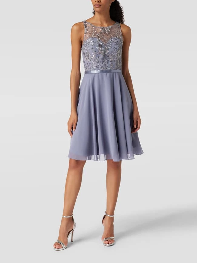 Das Cocktailkleid von LUXUAR FASHION ist aus strapazierfähigem Material gefertigt und gerade geschnitten. Es kommt in Knielänge, mit floraler Stickerei, Paillettenbesatz und Rundhalsausschnitt.