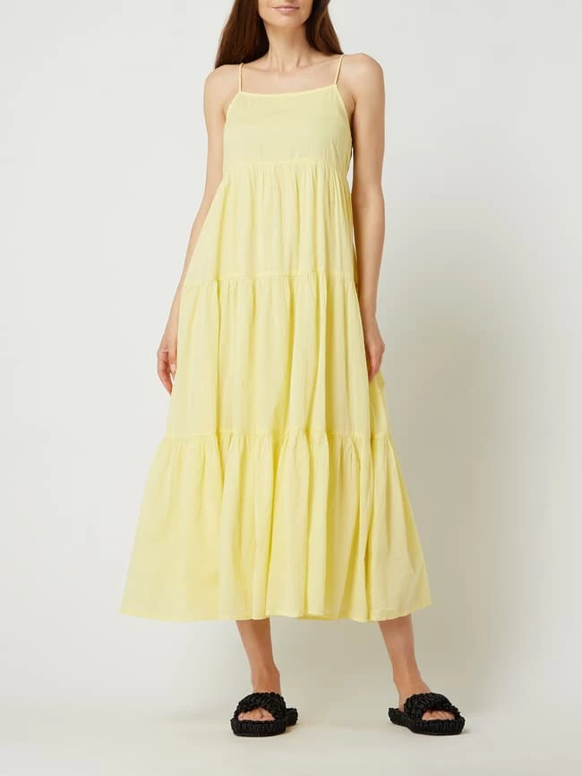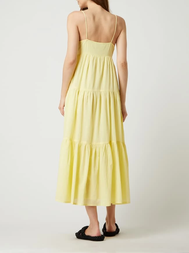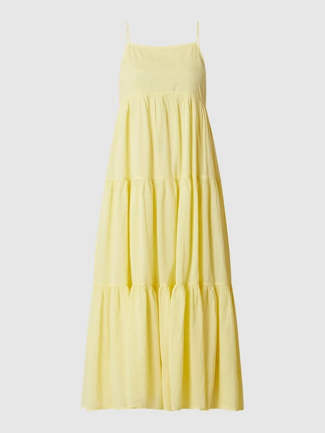 Das Maxikleid von MANGO ist aus reiner Baumwolle gefertigt und tailliert geschnitten. Es kommt im Stufen-Look mit Karree-Ausschnitt, Spaghettiträgern und Volantsaum.