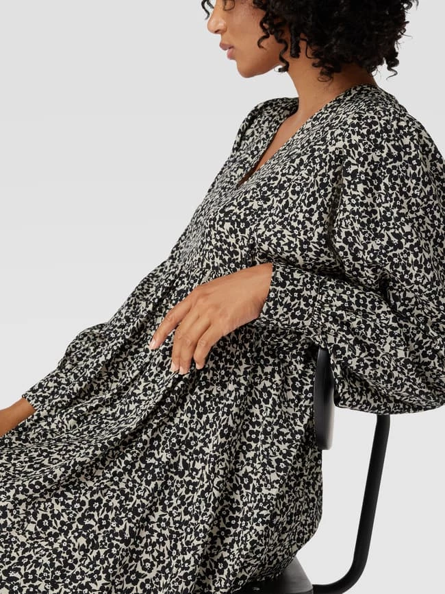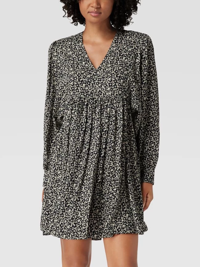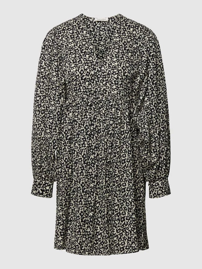 Das Blusenkleid von MARC O’POLO ist aus reiner Viskose gefertigt und ausgestellt geschnitten. Es kommt mit Allover-Muster, V-Ausschnitt und Volantsaum.
