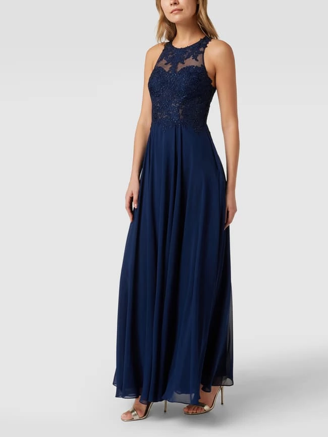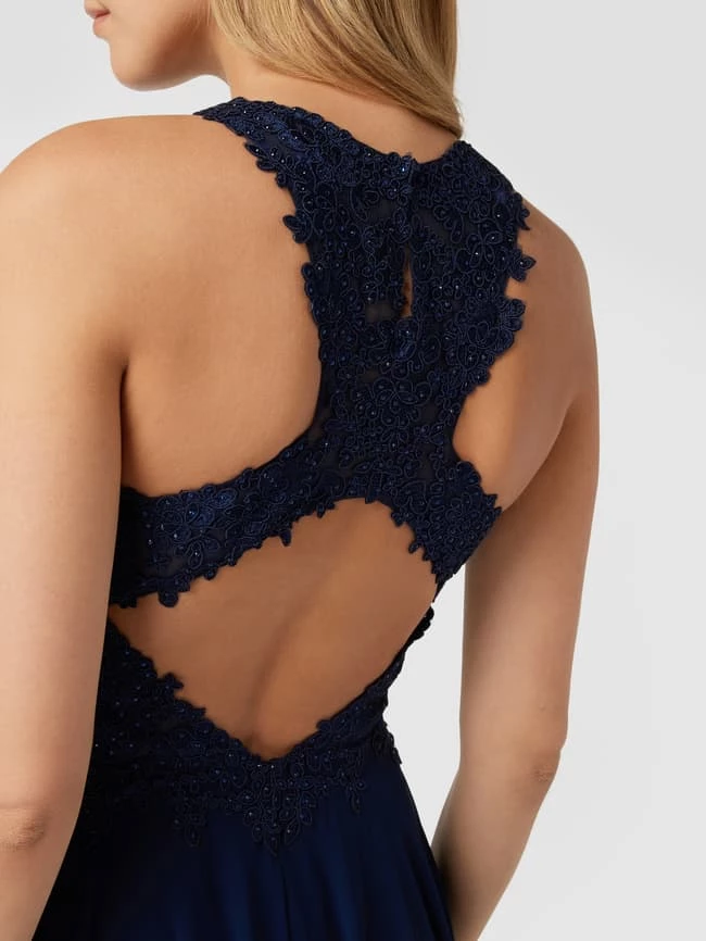 Das Abendkleid von Mascara ist aus strapazierfähigem Material gefertigt und tailliert geschnitten. Es kommt mit floralen Stickereien, breiten Trägern und Cut Outs sowie Ziersteinen.