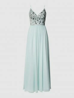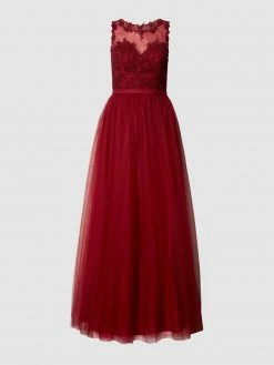 Das Abendkleid von Mascara ist aus Mesh und Chiffon gefertigt. Es kommt in taillierter Passform mit Ziersteinen, Herz-Ausschnitt und ausgestelltem Rockteil.