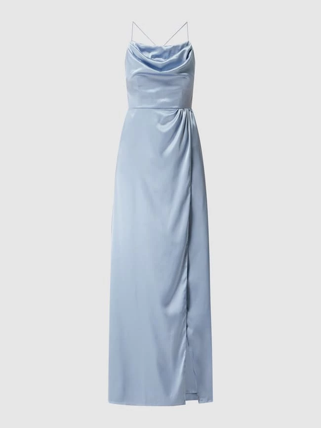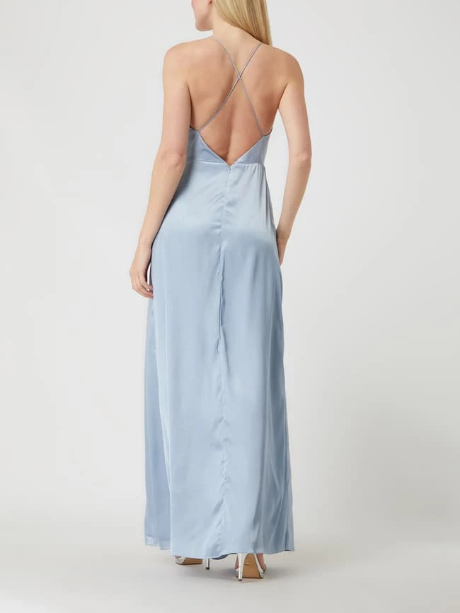 Das Abendkleid von Maya Deluxe ist aus Satin gefertigt und tailliert geschnitten. Es zeigt sich in Wickel-Optik mit Wasserfall-Ausschnitt, gekreuzten Spaghettiträgern und hohem Seitenschlitz.