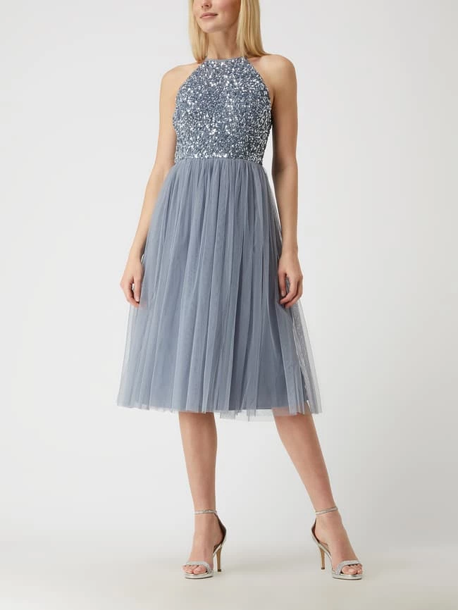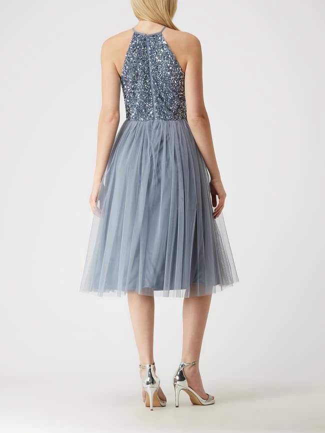 Das Cocktailkleid von Maya Deluxe ist aus Mesh gefertigt und tailliert geschnitten. Es zeigt sich mit amerikanischem Ausschnitt, Pailletten und ausgestelltem Rockteil.