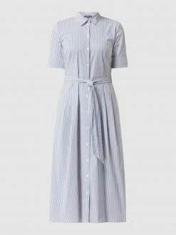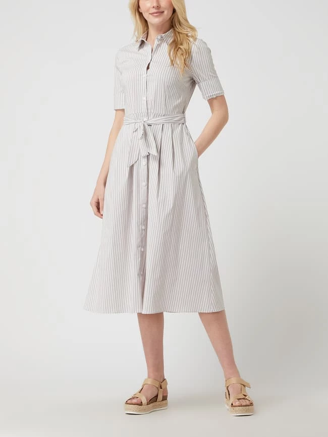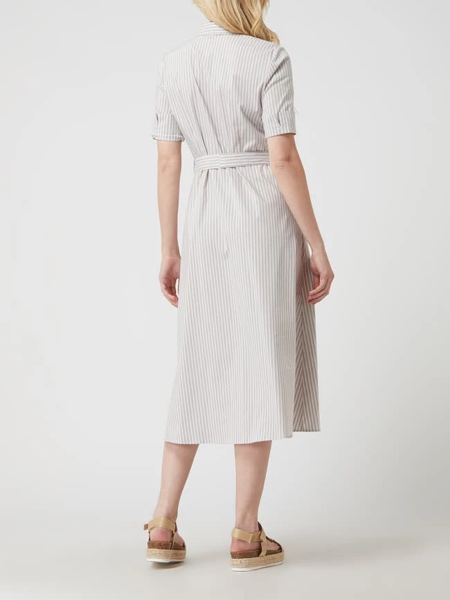 Das Hemdblusenkleid von MONTEGO ist aus einer Baumwollmischung mit Stretch-Anteil gefertigt. Es zeigt sich in taillierter Passform mit Streifenmuster, Umlegekragen und Knopfleiste.