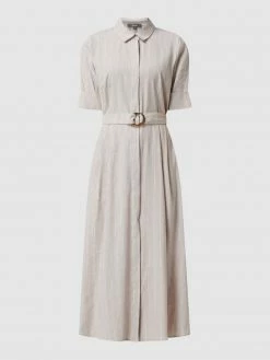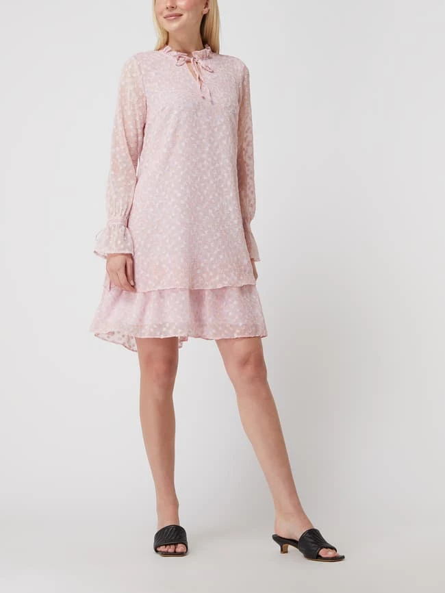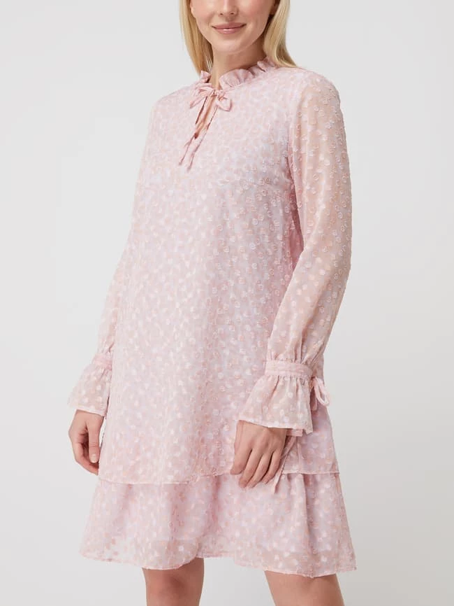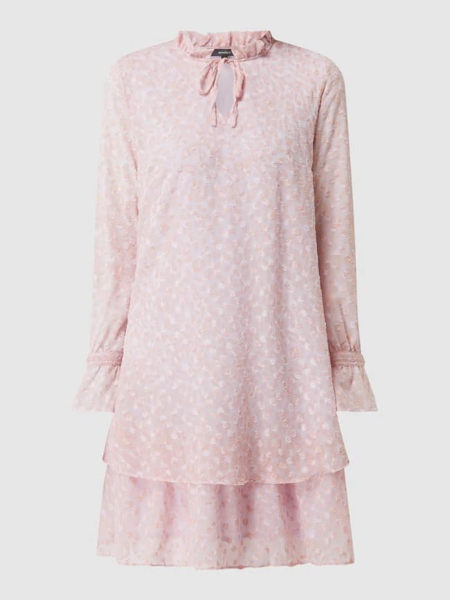 Das Kleid von MONTEGO ist aus leichtem Material gefertigt und ausgestellt geschnitten. Es kommt im Stufen-Look mit strukturiertem Muster, gerüschtem Stehkragen und Schnürung.