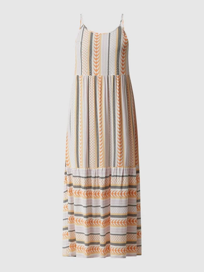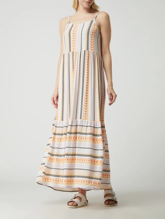 Das Maxikleid von MONTEGO ist aus reiner Viskose gefertigt. Es kommt in ausgestellter Passform mit Ethno-Muster, Rundhalsausschnitt und Spaghettiträgern.