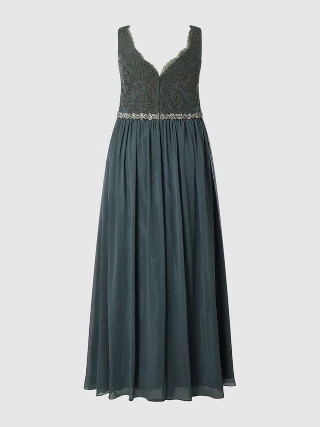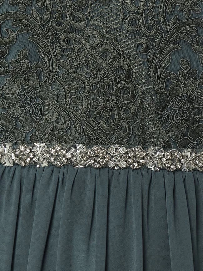 Das Abendkleid von Mascara Curve ist aus Tüll und Chiffon gefertigt. Es zeigt sich in taillierter Passform mit floralen Stickereien, Strasssteinen und tiefem Rückenausschnitt.