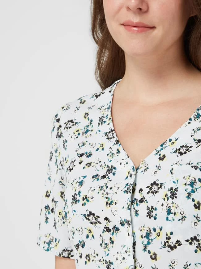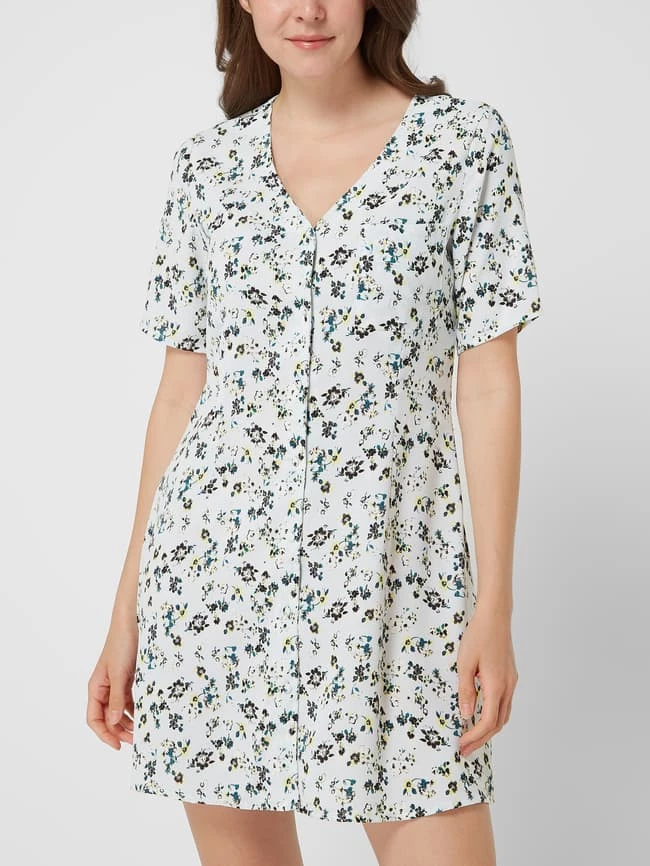 Das Blusenkleid von Noisy May ist aus leichtem Material gefertigt. Es zeigt sich in taillierter Passform mit Allover-Muster, kurzen Ärmeln und Brusttasche.
