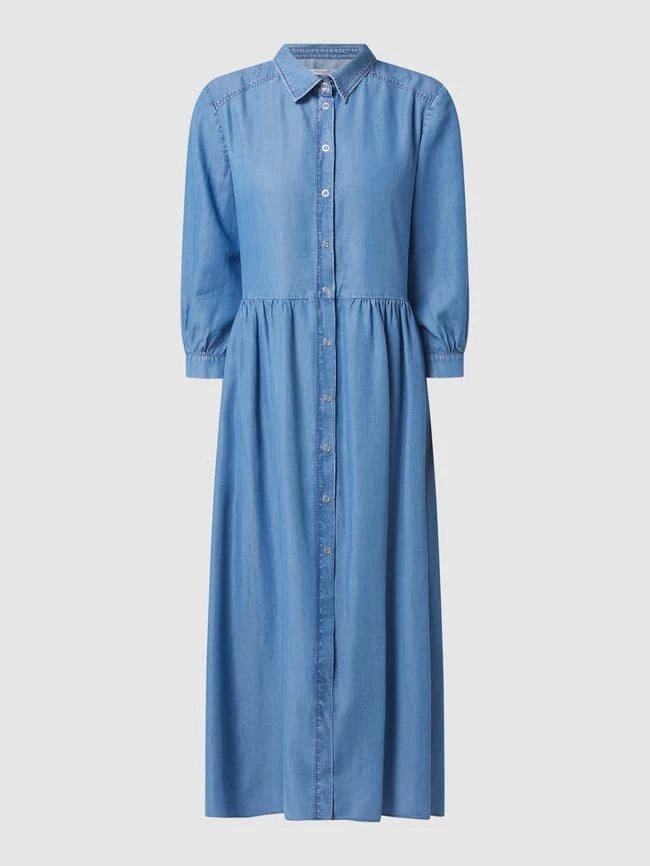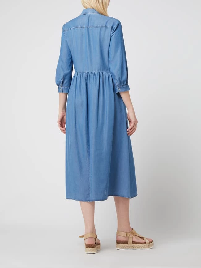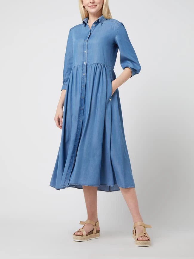 Das Blusenkleid von PENNYBLACK ist aus reinem Lyocell gefertigt und tailliert geschnitten. Es zeigt sich in Denim-Optik mit Druckknopfleiste, 3/4-Arm und Eingrifftaschen.