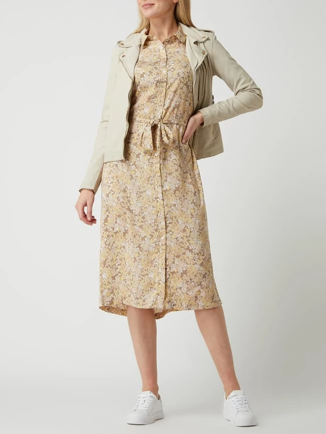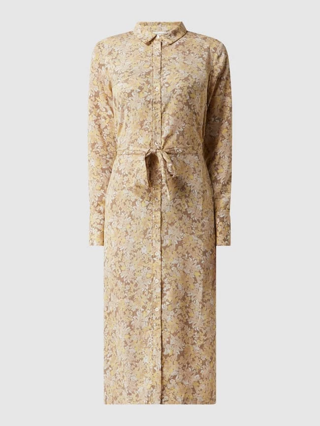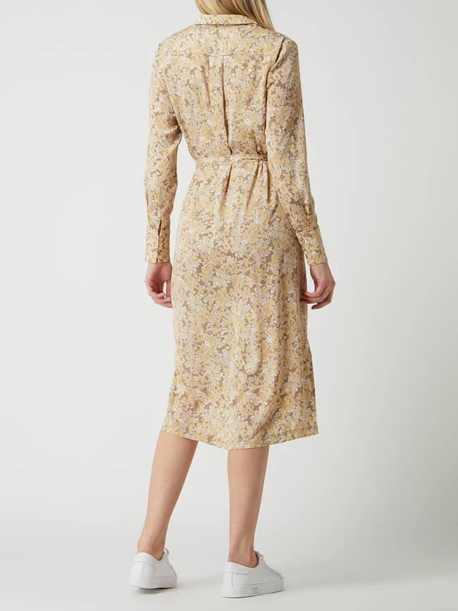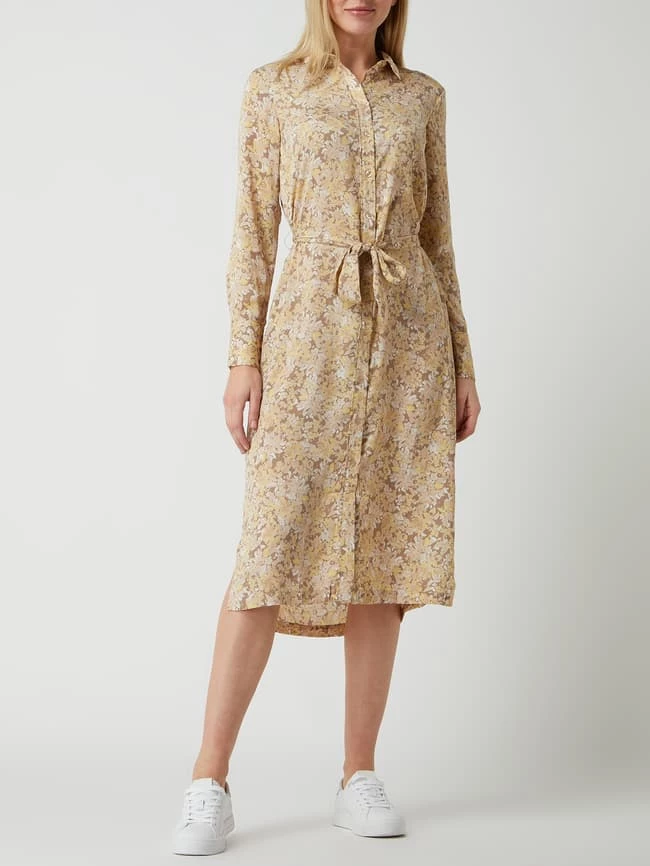 Das Blusenkleid von Rosemunde ist aus recyceltem Polyester gefertigt und tailliert geschnitten. Es kommt mit floralem Muster, Taillengürtel zum Binden und ausgestelltem Rockteil.