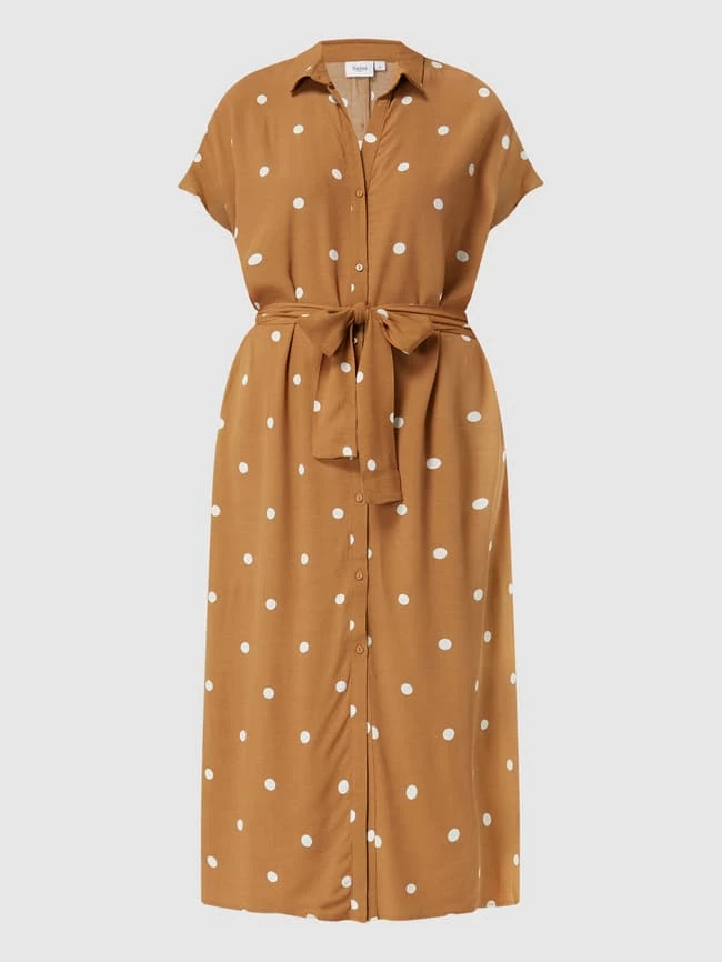 Das Blusenkleid von Saint Tropez ist aus reiner Viskose gefertigt und tailliert geschnitten. Es zeigt sich in Midilänge mit Polka Dots, Umlegekragen und gebundenem Gürtel.