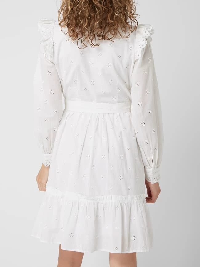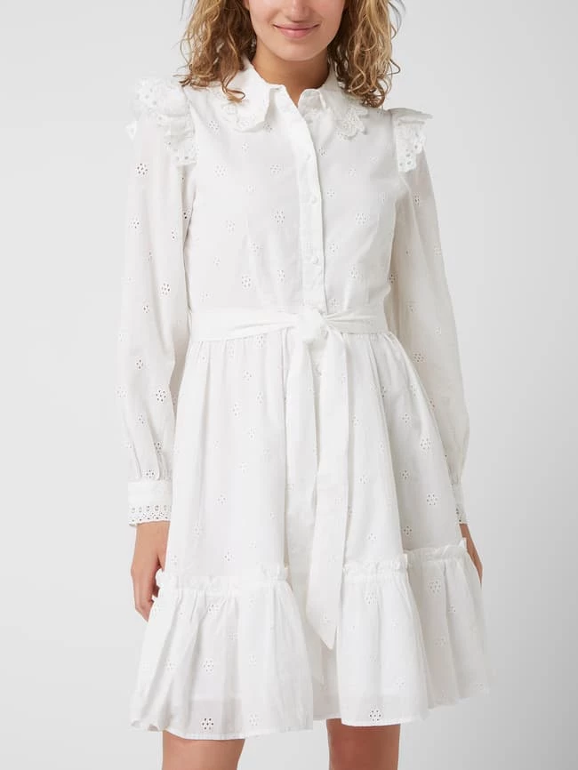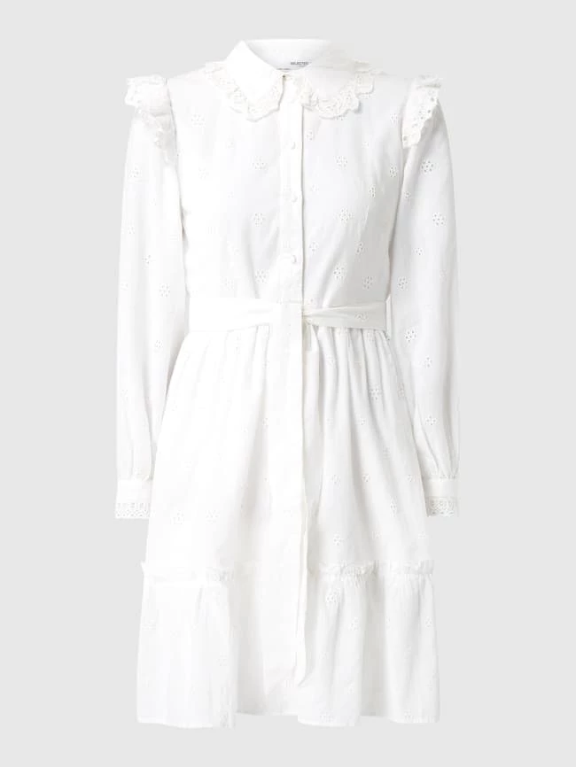 Das Blusenkleid von SELECTED FEMME ist aus reiner Bio-Baumwolle gefertigt. Es zeigt sich in taillierter Passform mit Lochstickerei, Volants und Rüschen.