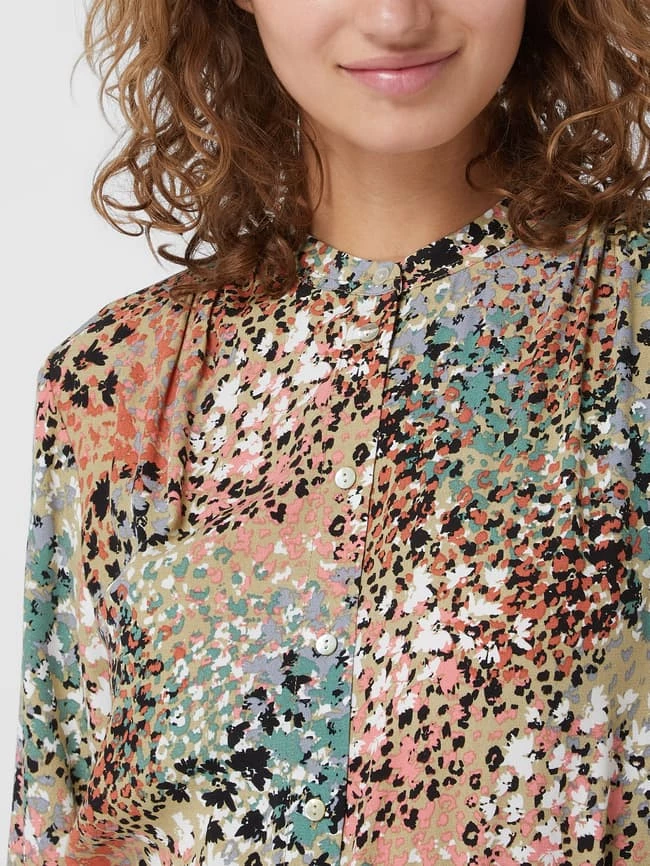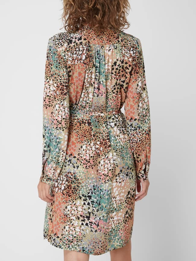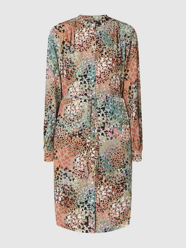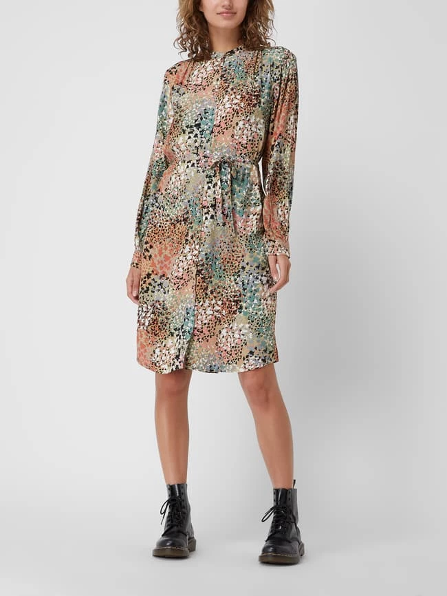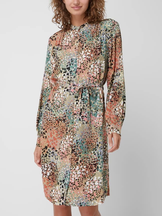 Das Blusenkleid von Soaked in Luxury ist aus reiner Viskose gefertigt. Es kommt in taillierter Passform mit Allover-Muster, schmalem Stehkragen und Taillengürtel zum Binden.
