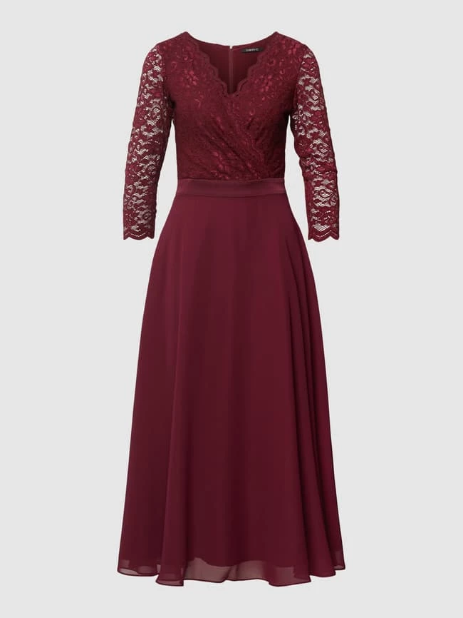 Das Cocktailkleid von SWING ist aus einem Material-Mix mit Stretch-Anteil gefertigt und in ausgestelltem Schnitt gehalten. Es zeigt sich mit Spitzenbesatz, V-Ausschnitt sowie Taillengürtel.