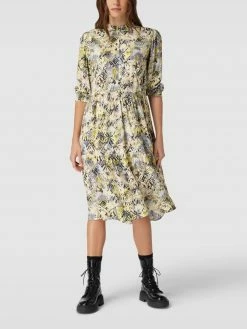 Das Blusenkleid von TAIFUN ist aus reiner Viskose gefertigt und ausgestellt geschnitten. Es zeigt sich mit Allover-Muster, Smok-Details und Stehkragen.