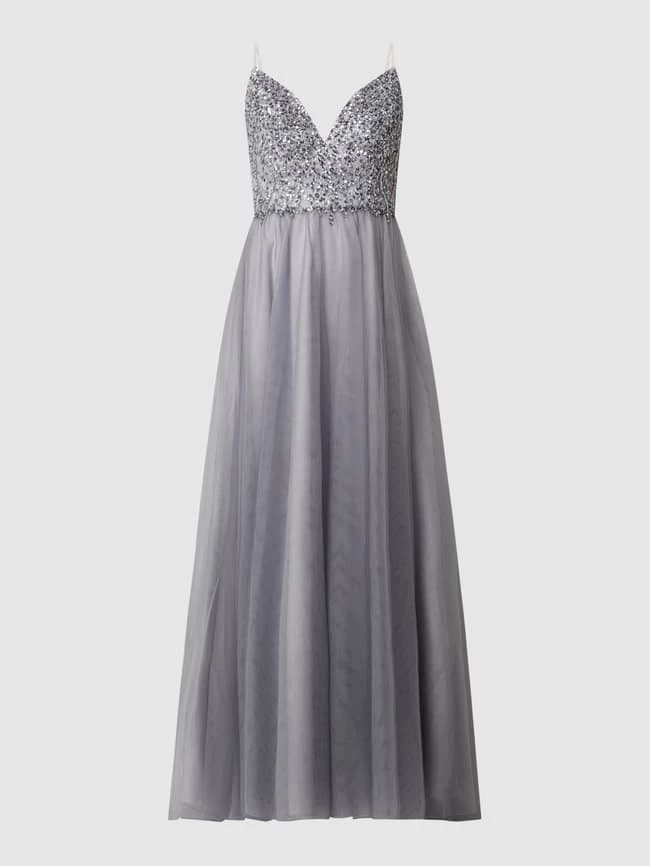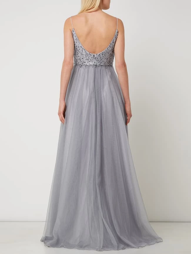 Das Abendkleid von unique ist aus Tüll gefertigt und tailliert geschnitten. Es zeigt sich mit Spaghettiträgern, Pailletten und hohem Seitenschlitz.