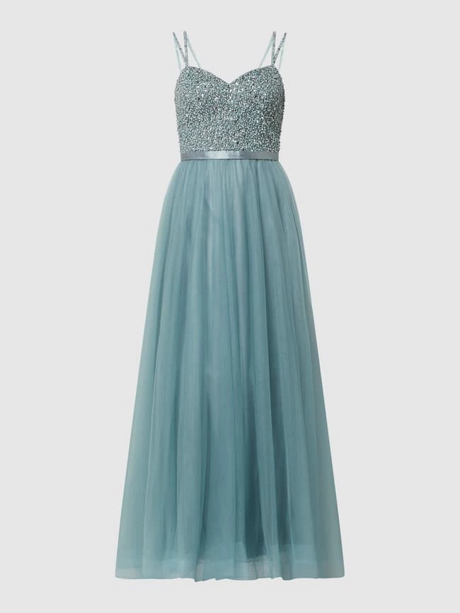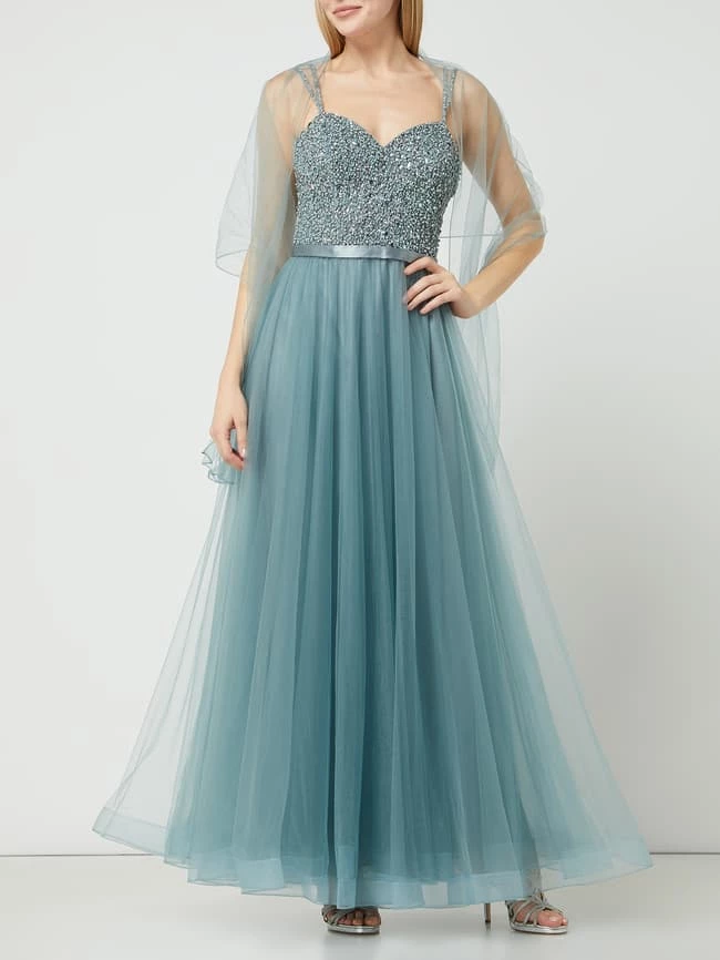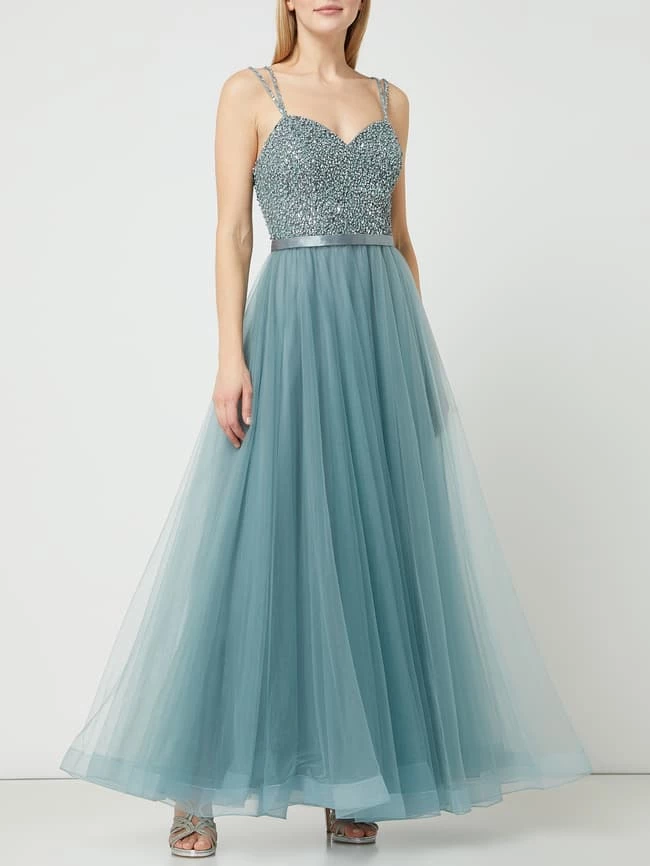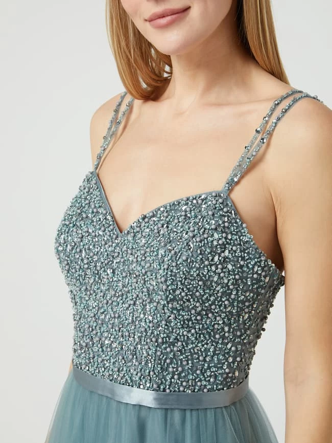 Das Abendkleid von unique ist aus Tüll gefertigt und kommt in taillierter Passform. Es zeigt sich mit Spaghettiträgern, Strassssteinen und ausgestelltem Rockteil.