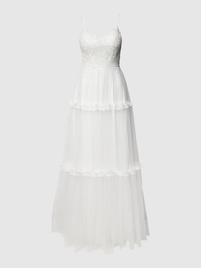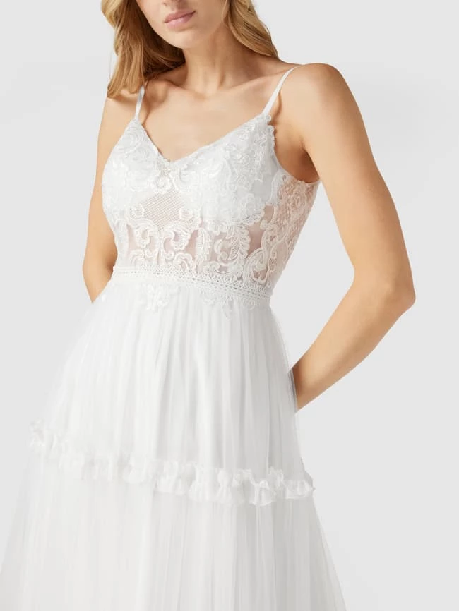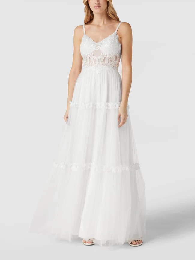 Das Brautkleid von unique ist aus strapazierfähigem Material gefertigt und tailliert geschnitten. Es zeigt sich mit transparentem Oberteil mit floralen Stickereien, Spaghettiträgern und Herz-Ausschnitt.