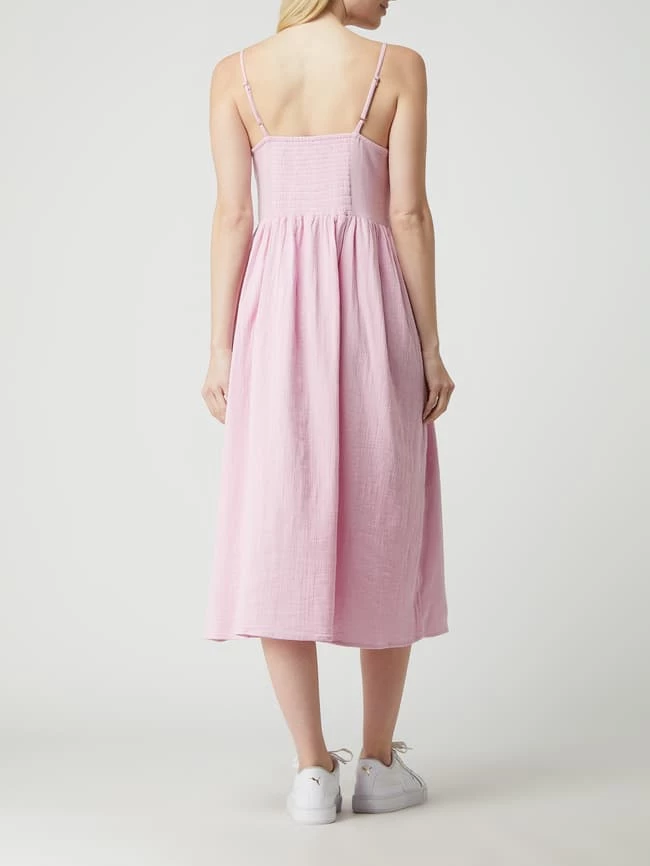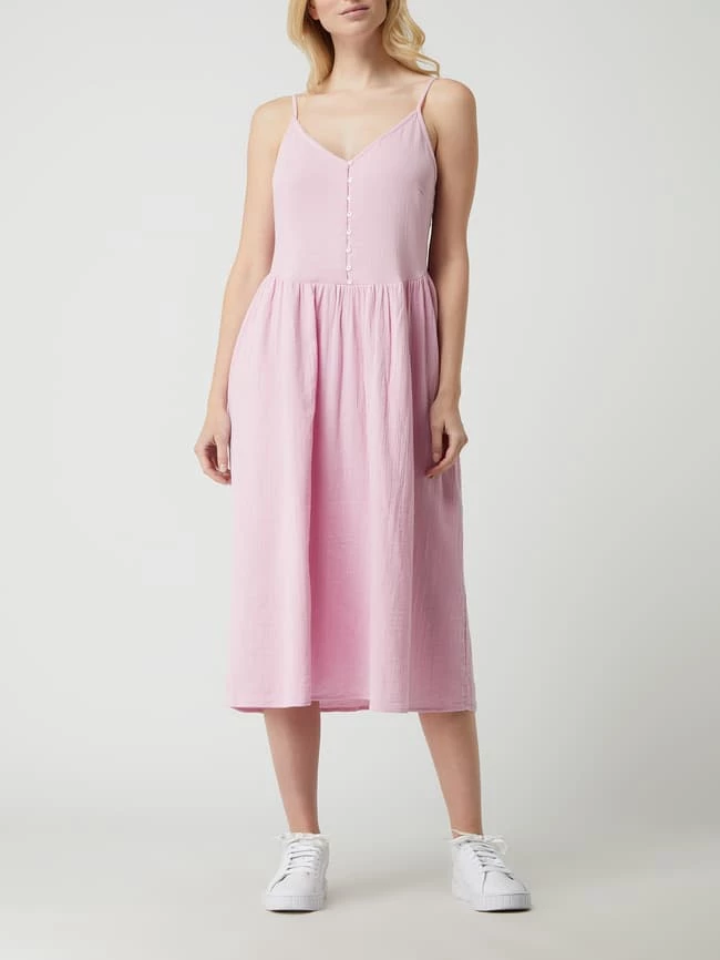 Das Kleid von Y.A.S ist aus reiner Bio-Baumwolle gefertigt und kommt in ausgestellter Passform. Es zeigt sich mit Rundhalsausschnitt, Spaghettiträgern und kurzer Knopfleiste.
