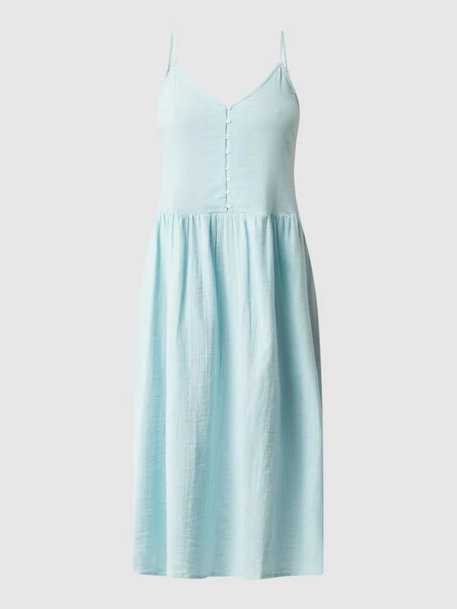 Das Kleid von Y.A.S ist aus reiner Bio-Baumwolle gefertigt und kommt in ausgestellter Passform. Es zeigt sich mit Rundhalsausschnitt, Spaghettiträgern und kurzer Knopfleiste.