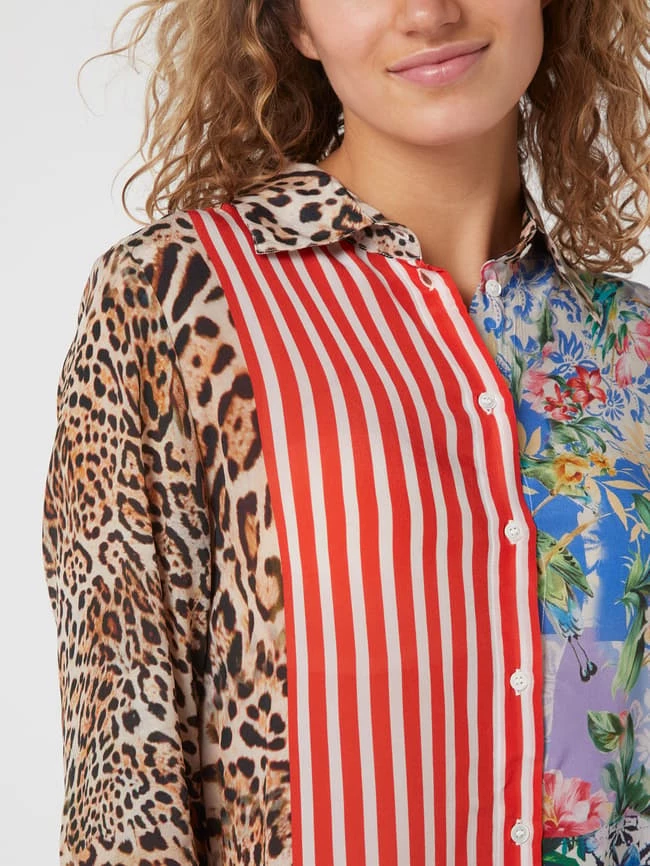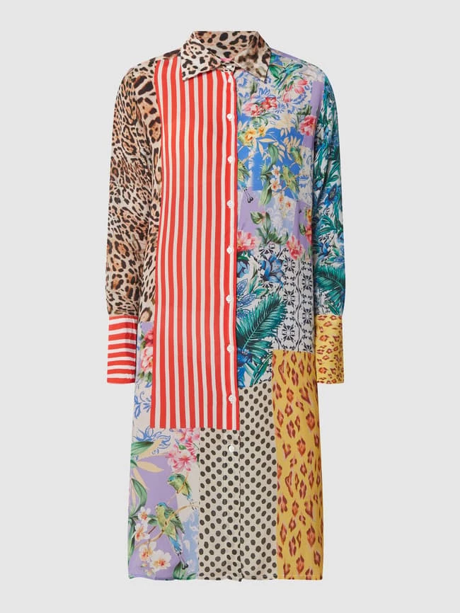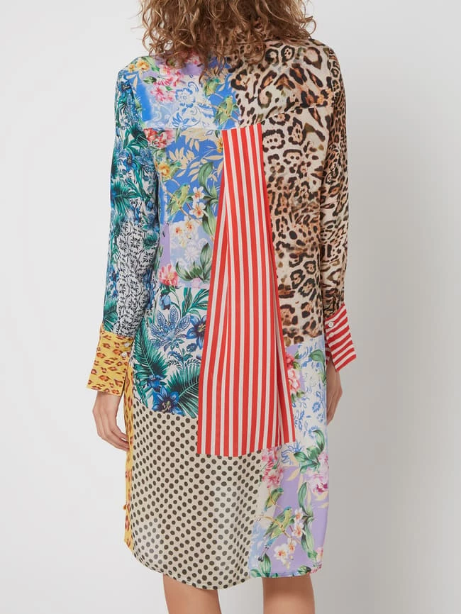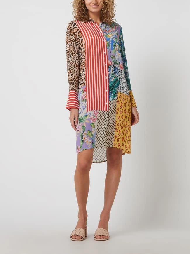 Das Blusenkleid von yippie hippie ist aus reiner Viskose gefertigt und ausgestellt geschnitten. Es zeigt sich im Patchwork-Look mit Mustermix und Umlegekragen.